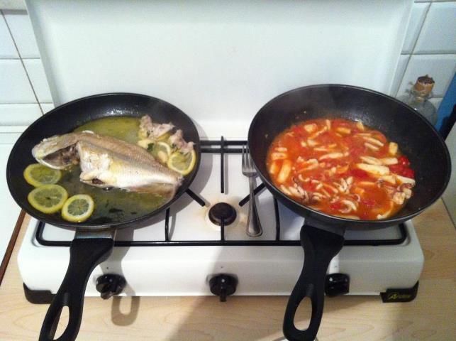 Sul primo piatto gira “Dentice al limone”. Sul secondo piatto gira “Calamari in umido”